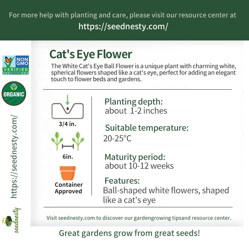 On a sunny morning, seeds were sown in the garden soil. Over time, the white, spherical flowers gradually emerged from the soil, resembling sparkling pearls. Neighbors were drawn to these unique flowers and flocked to admire them. Children played happily among the blossoms, seemingly interacting with these lovely plants. Whenever the flowers bloomed, the garden was filled with laughter and joy, making it an ideal place for family gatherings. The White Cat's Eye Ball Flower is more than just a plant; it symbolizes purity and beauty, adding endless joy to life.