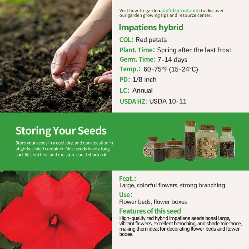 As high-quality hybrid Impatiens seeds, these plants produce vibrant red flowers with large, rich, lustrous colors, creating a striking visual impact. The plants exhibit excellent branching ability, vigorous overall growth, and a rounded, unspoiled shape. They are shade-tolerant and suitable for cultivation in low-light environments, such as indoor windowsills and under shaded garden trees. Whether planted in large flower beds or in containers like flower boxes and pots, these plants create a striking and vibrant addition to any landscape, highlighting a vibrant and bold style.