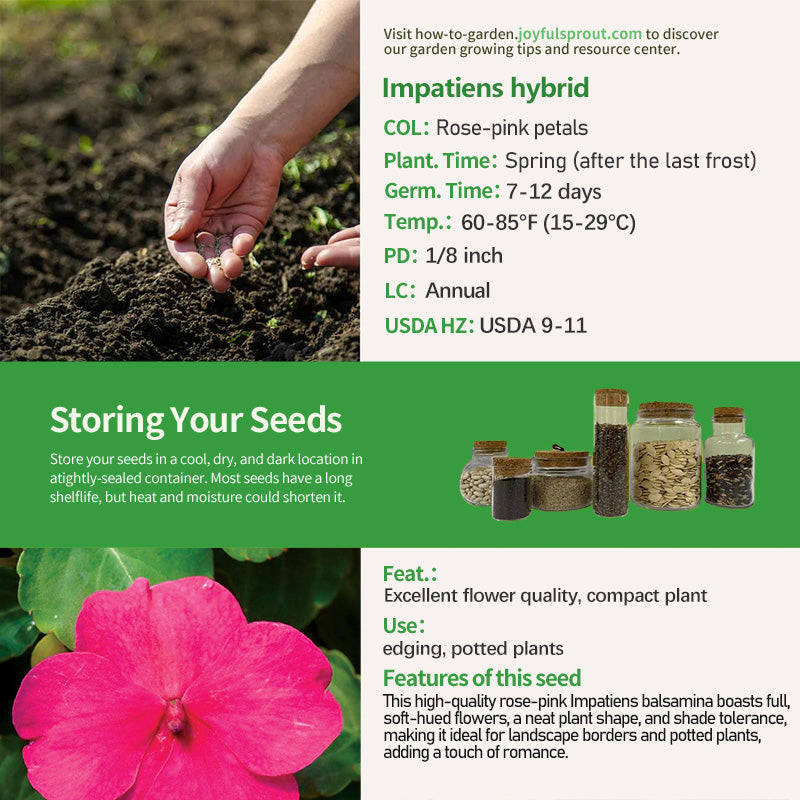 This premium Impatiens balsamina cultivar, specializing in rose-pink, features a natural gradation from light to dark pink, thick, lustrous petals, and round, full blooms resembling miniature roses. The plant grows 10-12 inches tall, with a compact, uniform shape and even branching, making it suitable for large-scale landscape arrangements. It is shade-tolerant and blooms well in the shade or in diffused light indoors, blooming throughout the warm season. Whether used as a border for a flower bed or placed in a pot on a windowsill, its romantic pink color adds an elegant touch. Its dense blooms ensure a beautiful appearance with minimal maintenance.