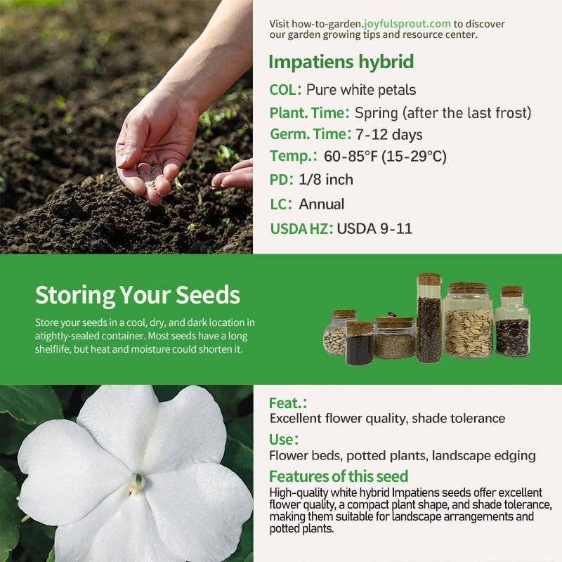 High-quality hybrid white Impatiens seeds focus on flower quality and plant shape. The flowers are pure white, large in diameter, and densely packed and full in bloom, making them highly ornamental. The plants grow neatly and with a uniform height, making them suitable for large-scale landscape arrangements such as flower beds and flower strips, and can also be used in pots to decorate indoor and outdoor spaces. They are shade-tolerant and can continue to bloom even in diffused light, making them an ideal choice for a clean and beautiful landscape.