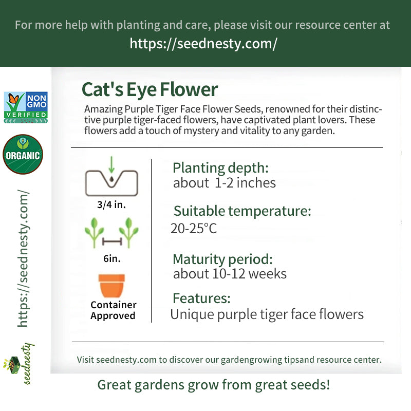 Amazing Purple Tiger Face Flower Seeds are a visual feast, producing unique purple tiger-faced flowers. The seeds quietly germinate in warm soil and, in the sunlight, gradually grow into tall flowers. Their petals, adorned with charming tiger stripes, seem to speak of nature's mystery and beauty. In the arrival of midsummer, the garden is filled with vibrant colors, attracting bees and butterflies. Neighbors are often drawn to the garden to admire these works of art. Amazing Purple Tiger Face Flower is more than just a garden decoration; it's a form of art in life, inspiring people to pursue color and beauty. Whenever the flowers bloom, they fill the home with warmth and joy.