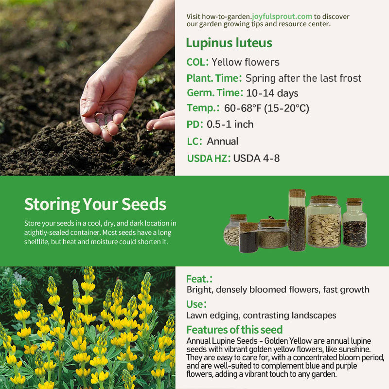 Annual Lupine Seeds - Golden Yellow focuses on vibrant color. Its pure yellow flowers are as dazzling as sunshine, and the flower spikes are full and compact, with multiple blooms per plant. Sow in spring, the flowers bloom in large clusters throughout the summer, lasting approximately 4-6 weeks, bringing vibrant energy to any garden. As an annual, it grows quickly, eliminating the need to wait for years for repeated blooms. It's a great choice for beginners or as a temporary landscape addition. With a height of approximately 18-22 inches and a wide plant, it's ideal for planting in front rows of flower borders, along lawn edges, or in pots. Paired with blue or purple lupines or lavender, it creates a classic "yellow and blue contrast" effect for a striking visual effect.