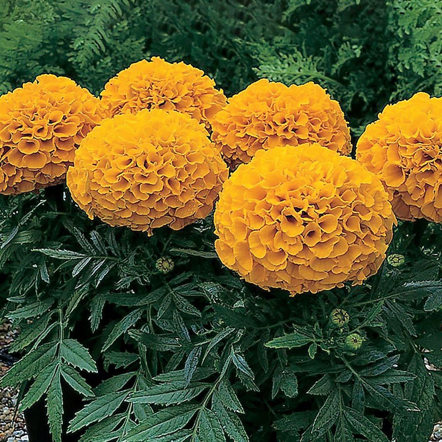 Antiga Orange Hybrid is a dwarf hybrid marigold variety. The plant is compact, 10-12 inches tall, with branches concentrated at the base, creating a full-bodied plant. The flowers are 3 inches in diameter, fully double, and have neatly arranged, vibrant orange petals. This variety is not very demanding on day length and blooms early, producing numerous flowers that completely cover the plant. It is suitable for the front edge of a flower bed, creating a layered foreground. It is also well-suited for container planting, window sills, patios, and other areas.