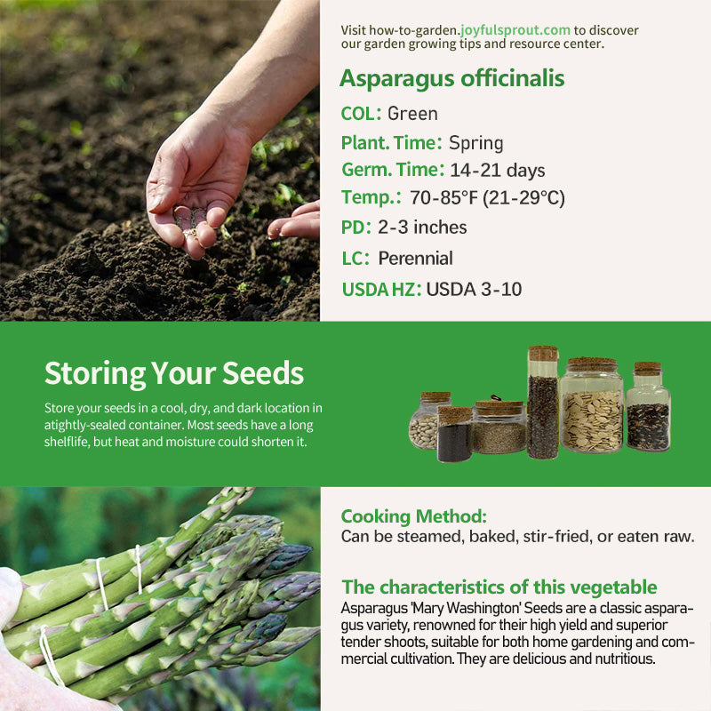 Imagine spring sunshine streaming into your garden, the tender shoots of Asparagus 'Mary Washington' swaying in the breeze. This asparagus is widely loved for its rich nutrients and unique flavor. It is rich in Vitamin K, Vitamin C, and folic acid, which can boost immunity and promote overall health. Every bite is packed with fiber, aiding digestion and helping maintain a healthy weight. Simply season fresh Mary Washington asparagus with olive oil and garlic, then lightly roast it for a delicious meal. Whether served as a side dish or added to salads, it adds color and nutrition to your meals. Choose Asparagus 'Mary Washington' Seeds, begin your gardening journey, let health and deliciousness accompany you, enjoy the joy of harvest, and bring fresh, delicious flavors and nutrition to your family.