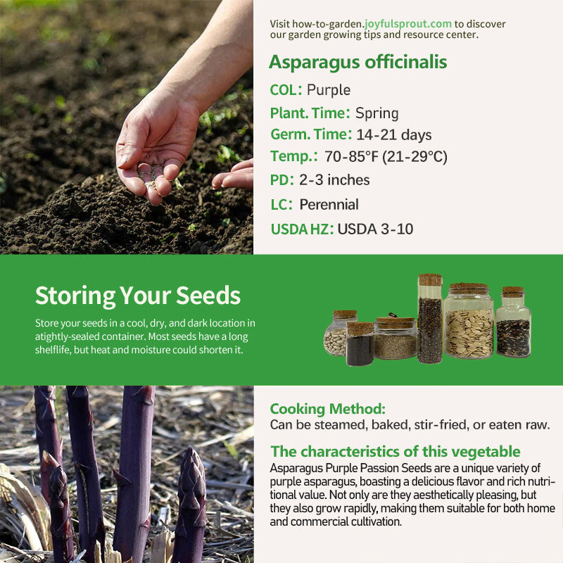 Imagine walking into your garden on a sunny spring morning and being greeted by a vibrant patch of Asparagus Purple Passion asparagus. Its purple stems shimmer captivatingly in the sunlight, waiting to be harvested. This asparagus is not only unique in appearance but also rich in healthy nutrients, especially antioxidants and vitamins A, C, and E, which help boost immunity and promote healthy skin. Every bite is packed with fiber, aiding digestion and maintaining a healthy weight. Imagine simply seasoning fresh purple asparagus with olive oil, minced garlic, and lemon juice, then lightly roasting it for a delicious and visually appealing dish. Whether served as a side dish with a main course or added to a salad, Asparagus Purple Passion adds nutrition and flavor to your meals. Choose these seeds to revitalize your garden and enjoy the perfect combination of health and deliciousness.