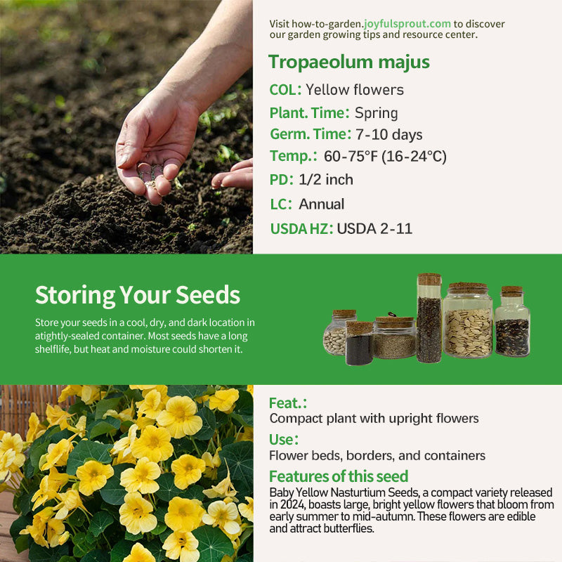 Baby Yellow Nasturtium Seeds, a new variety released in 2024, is an annual plant. It has a compact, rounded, shrub-like shape, reaching approximately 12 inches in height. Its dark green leaves and yellow flowers bloom continuously from early summer to mid-autumn, with upright, non-tumbling flowers. This variety is easy to grow and tolerates drought, heat, cold, rain, and strong winds. It is suitable for planting in full sun to partial shade in well-drained soil. It is suitable for use in flower beds, borders, or containers, and can also serve as a pest control in organic gardens.