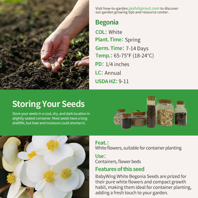 On a tranquil morning, BabyWing White Begonia Seeds are like a gentle breeze, their pure white blossoms shimmering in the sunlight, radiating a captivating brilliance. Each blossom is a delicate work of art, bringing a sense of tranquility and elegance. Planting these begonia seeds will allow you to experience the joy of connecting with nature. They are highly adaptable and can grow in containers, becoming a vibrant addition to your balcony or flower bed. Imagine strolling through your garden as the pure white blossoms twinkle like stars, seemingly telling a moving story. BabyWing White Begonias not only add a fresh touch to your garden, but also offer a sense of tranquility and beauty amidst your busy lives. Every time you see these flowers, you'll feel a sense of contentment, as if you're immersed in the embrace of nature.