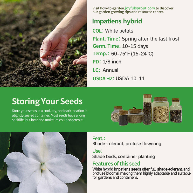 Plants grown from these hybrid Impatiens seeds produce round, full, and pure white flowers with no variegated color. They branch well, maintaining a full, compact shape and excellent shade tolerance, allowing them to bloom continuously even in low-light environments. They also adapt well to moist soils and require minimal care, making them suitable for garden corners, shaded areas, or as potted plants for indoor and outdoor spaces, creating a fresh and elegant atmosphere.