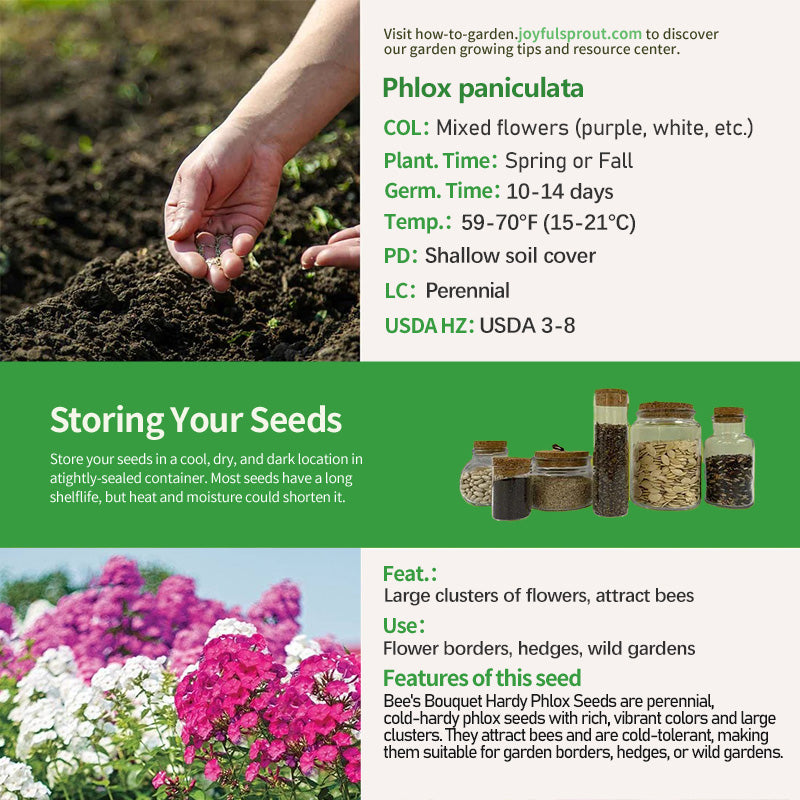 Bee's Bouquet Hardy Phlox Seeds are specially designed for cold-weather phlox, allowing them to safely overwinter in low temperatures. The flowers are rich in color, including purple and white, and the clusters are large, reaching 4-6 inches in diameter. Each cluster has 20-30 small flowers with trumpet-shaped petals. When in full bloom, the clusters resemble full "bouquets" and are lightly fragrant. They are a key nectar source for bees and butterflies. The plants grow approximately 24-36 inches tall, with an upright, upright form, making them ideal as background plants in flower borders. Their oval, glossy, dark green leaves provide seasonal variation. It is cold-tolerant, with USDA hardiness zones 3-8. After its ground-level dies back in winter, it will re-sprout the following spring. Its flowering period lasts from summer to early fall. It is moderately drought-tolerant and only requires regular watering.