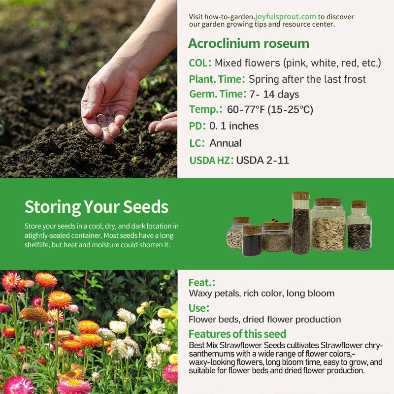 Best Mix Strawflower Seeds are highly ornamental strawflower seeds. After sowing, the plants produce flowers in a wide range of colors, including pink, white, red and other colors flowers with waxy, glossy petals and a full flower shape. Strawberry flowers are long-lasting, blooming from summer to fall, and do not wither easily after drying, so they can be dried and preserved for a long time. It is a well-adapted plant that prefers sunny conditions and grows well in well-drained soil.