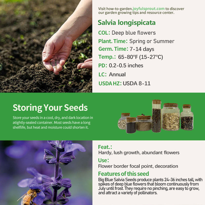 Big Blue Salvia is a vigorous plant that produces spikes of clear, deep blue flowers starting in July and continuing until frost. The tall spikes attract pollinators such as hummingbirds, bees, and butterflies. It is an easy-to-grow and highly ornamental plant that requires no pinching and thrives even with minimal care. It thrives in hot, low-water environments, reaching a height of 24-36 inches. Seeds can be grown indoors and transplanted into the garden, or they can be grown in containers. It grows best in full sun but can tolerate partial shade.