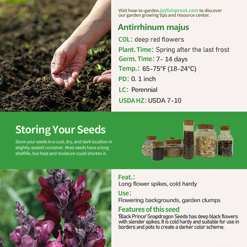 'Black Prince' Snapdragon Seeds are known for their distinctive flower color, with densely packed flowers on slender spikes for a three-dimensional look. Plants are 30-36 inches tall, with strong, topple-resistant stalks and thick, dark green foliage that provides a backdrop for the deep red flowers. Hardy to USDA zones 7-10, it blooms in early spring and flowers well into fall. Excellent as a background plant for borders, contrasting with lighter-colored flowers, or planted in clusters to create a darker focal point in the corner of the yard, or cut spikes for vases to add a distinctive atmosphere to a room.
