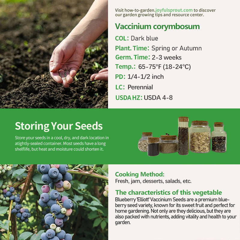 Blueberry 'Elliott' Vaccinium Seeds are an ideal choice for every gardening enthusiast, prized for their abundant fruit and exceptional taste. 'Elliott' blueberries turn a mesmerizing deep blue when ripe, with large, plump berries that are sweet with a hint of tartness. These blueberries are rich in antioxidants, vitamin C, and dietary fiber, helping to boost immunity, aid digestion, and maintain cardiovascular health.