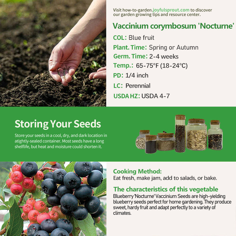 Growing Blueberry 'Nocturne' Vaccinium Seeds will give you a healthy and delicious gardening experience. This blueberry variety is loved for its abundant fruit and unique flavor, making it especially suitable for home gardens. As spring arrives, you can sow these seeds and watch them thrive in the sunshine, bloom beautifully, and eventually yield a bountiful harvest of blueberries. Each blueberry is not only delicious but also rich in antioxidants, vitamin C, and dietary fiber, which help boost immunity, promote heart health, and improve digestion. Imagine making refreshing juice with fresh blueberries or adding them to your breakfast oatmeal to energize your day. Growing 'Nocturne' blueberries is not only about enjoying a bountiful harvest but also a way to provide your family with healthy, delicious options, making every meal infused with natural sweetness and nutrition.