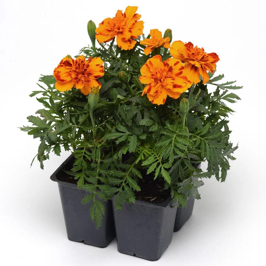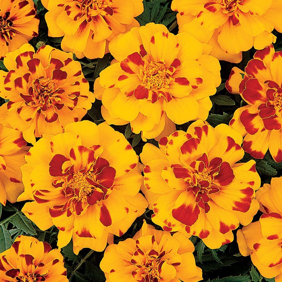 Bonanza Bolero, a 1999 National Selection award-winning variety, is an early-flowering dwarf French marigold. The plant reaches approximately 10-12 inches tall, with a uniform, upright, compact form and dense, lush foliage. The flowers are large, 2- to 3-inches in diameter, and are double golden yellow with red tips. Each flower's two-color combination creates a unique color pattern. Blooming begins in spring and continues until late summer, and in some areas, until the first frost, with dense blooms. This variety attracts insects such as bees, butterflies, and hummingbirds, making it suitable for beds, borders, and containers. It also acts as an insect repellent in the vegetable garden.
