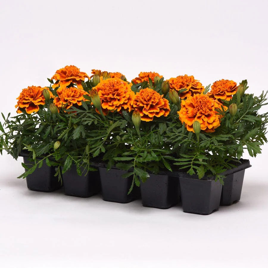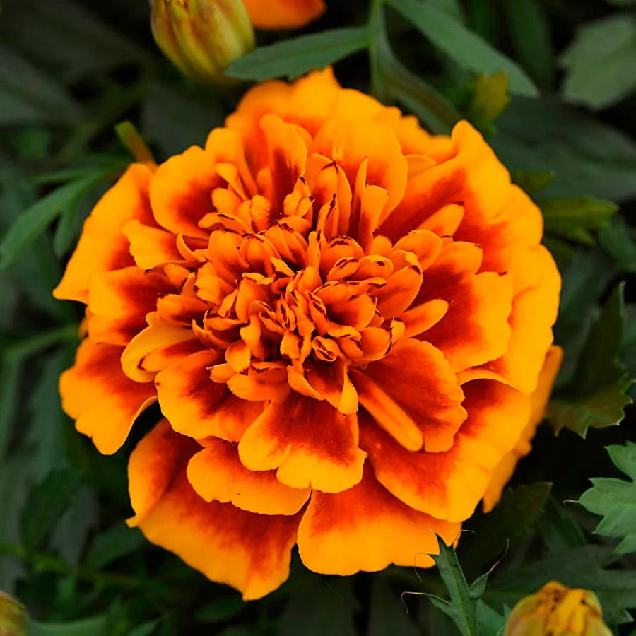 Bonanza Flame is a French marigold variety. It has a compact plant height of 10-12 inches and a crown width of 6-8 inches. Its flowers, up to 2 inches in diameter, are a distinctive mahogany color with an orange edge. This variety blooms profusely, with numerous flowers and a well-developed blooming habit. It is adaptable to a wide range of environmental conditions and performs well outdoors. Whether potted on balconies, windowsills, or used in flower beds or borders, its unique color and abundant blooms will attract attention and are well-suited for retail sales.
