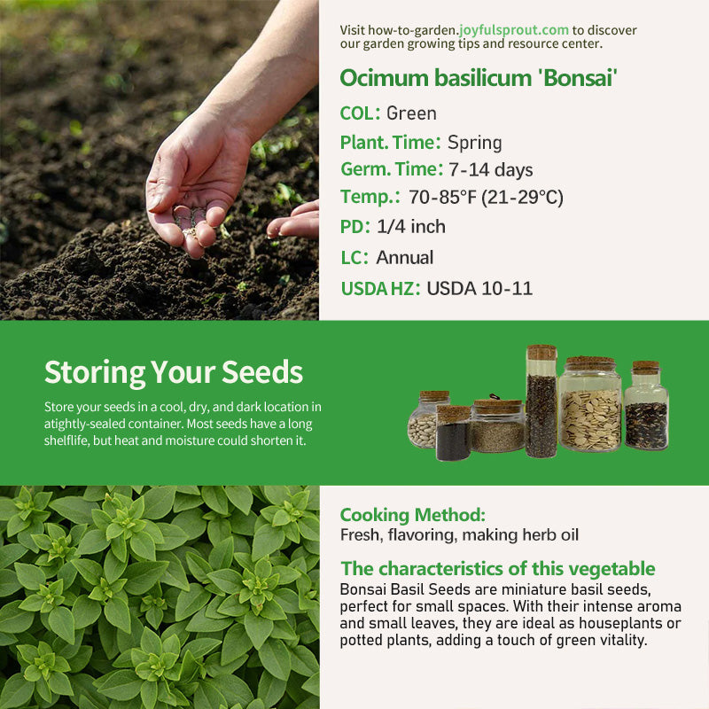 Bonsai Basil Seeds are miniature basil seeds designed for small spaces, perfect for growing on balconies or windowsills. Their small leaves emit a strong aroma that's irresistible. Imagine growing these lovely Bonsai basils at home, casually picking a few fresh leaves to add to salads or pasta, adding a unique flavor to your dishes. Bonsai Basil is rich in Vitamin K, Vitamin A, and antioxidants, which can help boost immunity and improve digestion. Whether used as a houseplant or a cooking ingredient, Bonsai Basil brings both health and deliciousness to your life. It's not only a great helper in the kitchen but also a touch of green in your living space, making every day vibrant.