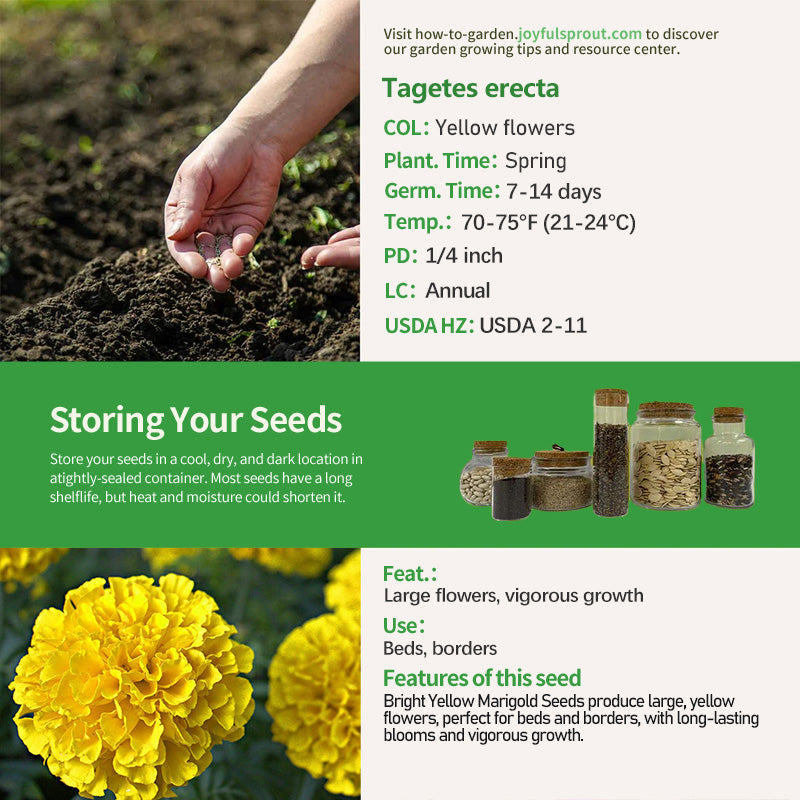 Bright Yellow Marigold Seeds are a fast-growing yellow marigold suitable for beds and borders. Their large, full flowers are striking in full sunlight, and their blooms last from summer to autumn. This adaptable plant thrives in a variety of soil conditions and is easy to care for, making it perfect for both beginners and busy gardeners. Simply provide adequate water and sunlight during planting to enjoy beautiful blooms.