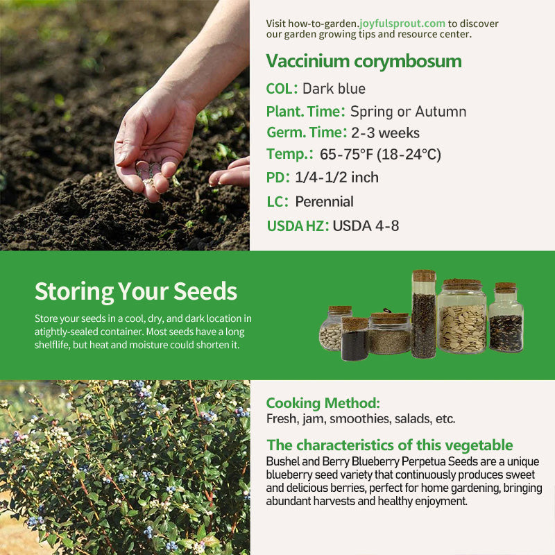 Bushel and Berry Blueberry Perpetua Seeds are the stars of your garden, designed for gardening enthusiasts who crave a continuous harvest. This blueberry plant is known for its persistent fruit production, providing a constant supply of fresh blueberries throughout the growing season. Ripe berries are an appealing deep blue, sweet in taste, and rich in antioxidants, vitamin C, and dietary fiber, helping to boost immunity, aid digestion, and maintain heart health.