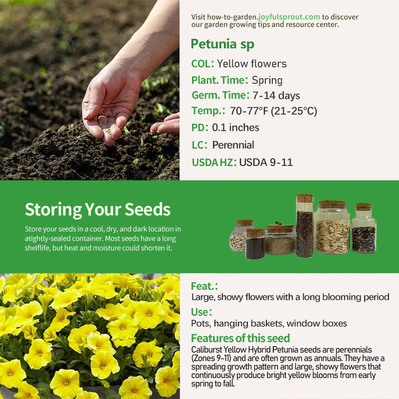 Caliburst Yellow Hybrid Petunia seeds have a spreading growth pattern, naturally forming a plump, vibrant head of flowers. The flowers are large, eye-catching, and feature a bright, vibrant yellow with distinctive textured petals. As a perennial in Zones 9-11, often grown as an annual, Caliburst has an exceptionally long flowering period, beginning in early spring and continuing into fall. During this extended period, the flowers continuously bloom, providing a long-lasting, vibrant colorscape. Caliburst is highly adaptable and can grow in full sun or partial shade. It is well-suited for pots, hanging baskets, window boxes, borders, and as a groundcover, all displaying its unique ornamental value.