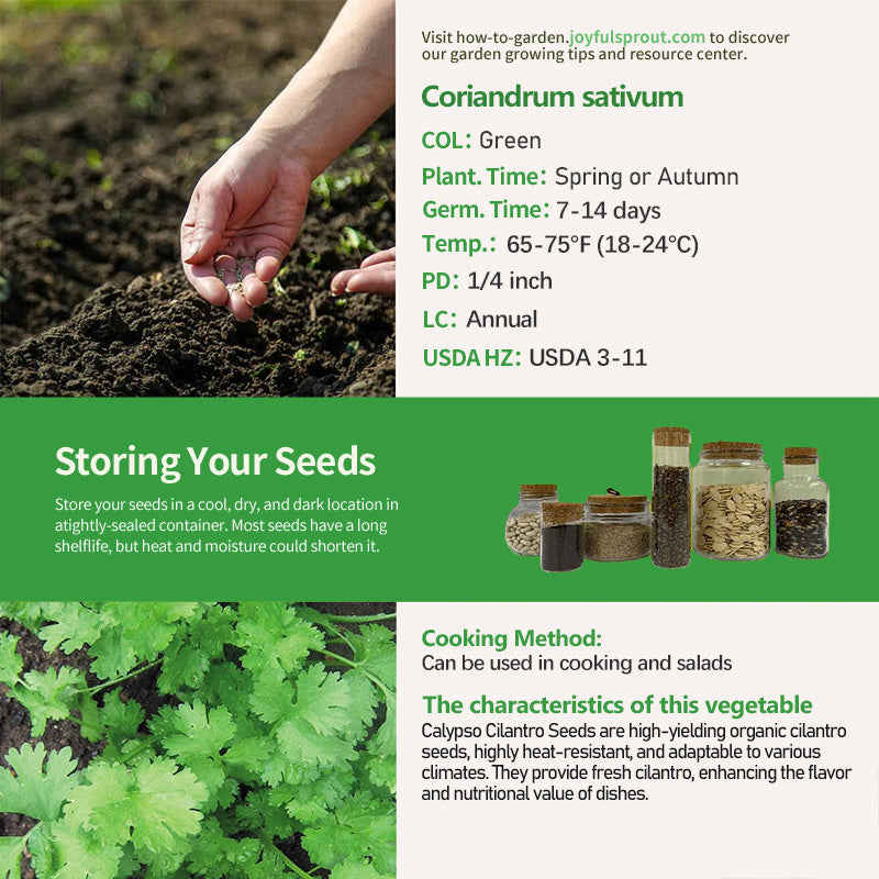 Calypso Cilantro Seeds are high-yielding organic cilantro seeds, especially suitable for those who love cooking. Imagine planting these cilantro seeds in your garden, enjoying their fresh aroma as they grow. Known for its heat resistance and rapid growth, Calypso cilantro thrives in diverse climates, providing fresh cilantro perfect for a variety of dishes. Rich in vitamins and minerals, cilantro has antioxidant and anti-inflammatory properties, helping to boost the immune system and promote digestion. Imagine using these fresh Calypso cilantro seeds in your kitchen, adding unique flavor to your dishes and enjoying the pleasure of cooking. Calypso Cilantro Seeds not only beautify your garden but also bring health and deliciousness to your table.
