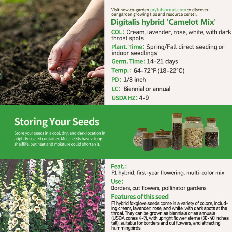 F1 hybrid foxglove seeds bloom in their first year after sowing, forming 30-40-inch tall flower stems with petals in colors including cream, lavender, rose, and white, with dark spots at the throat. They require full sun or partial shade and prefer moist, fertile soil (pH 6.0-7.0). As a biennial, they produce seeds after flowering and can self-sow, but in temperate regions, they are often grown as annuals to ensure continued flowering. Their upright flower stems require no support and are well-suited for landscapes with ferns and ornamental grasses, creating a natural and wild landscape. Germination occurs 14-21 days after sowing, requiring a thin layer of vermiculite to keep the soil moist. This variety attracts hummingbirds and butterflies, making it a pollinator-friendly plant.