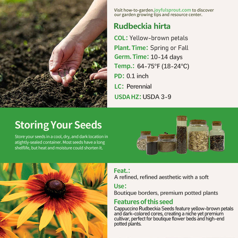 Cappuccino Rudbeckia is a niche premium cultivar among Rudbeckias. Plants grown from seeds have a distinctive yellow-brown color and dark-colored cores, creating a subdued, understated color while exuding a sense of sophistication. The flowers measure approximately 3-3.5 inches in diameter. The plants grow to a height of approximately 20-26 inches, with a slender yet upright stem and oblong, light green leaves. The plant maintains a loose yet dynamic form. It prefers full sun, is drought-tolerant, and tolerates mild infertility, blooming from mid-summer to early autumn.