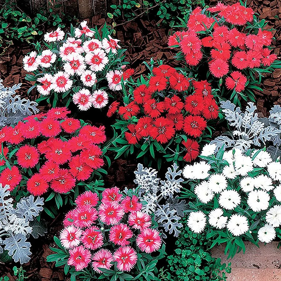 This 6-inch dwarf groundcover dianthus is characterized by its dense carpet-like growth. Its flowers come in white, pink, red, and other multicolored colors, with slightly ruffled petal margins. It is hardy (USDA zones 3-9) and tolerates poor soil conditions. It requires low maintenance, requiring only regular watering and post-flowering pruning to prolong its blooming period. It grows as a biennial or short-lived perennial, and can be grown as an annual in warmer regions. It requires full sun and well-drained soil. Germination occurs 7-10 days after sowing, and a spacing of 6 inches is recommended. This dianthus is suitable for rock gardens, large groundcovers, and flowerbed borders. It can be combined with ornamental grasses to create a natural and wild landscape effect.