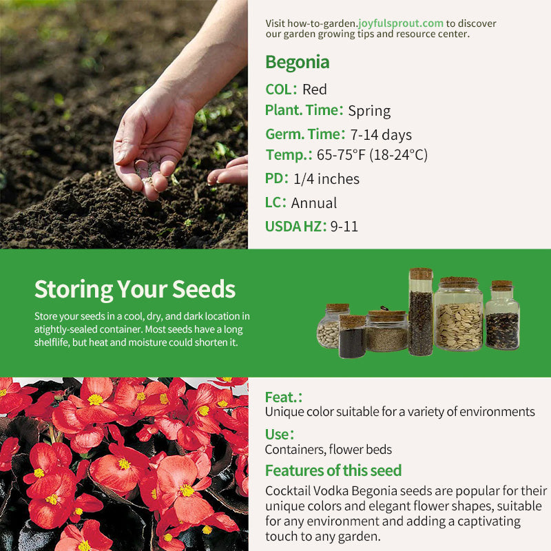 On a sunny afternoon, step into your garden and Cocktail Vodka Begonias are like a refreshing cocktail, their vibrant colors and elegant flower shapes captivating. Each blossom is a delicate work of art, attracting bees and butterflies. Planting these begonia seeds not only allows you to enjoy the joy of gardening but also allows you to experience the beauty of connecting with nature. They grow quickly and are highly adaptable, thriving in sunny conditions and becoming the stars of your flower beds. Imagine gathering around your flower beds with family and friends, admiring these beautiful flowers and sharing the joys of life. Cocktail Vodka Begonias will not only add vitality to your garden but also bring endless joy and beauty. Every time you see these flowers, you'll feel a sense of contentment, as if you were immersed in the embrace of nature. Let Cocktail Vodka Begonias add a unique charm and vitality to your garden.