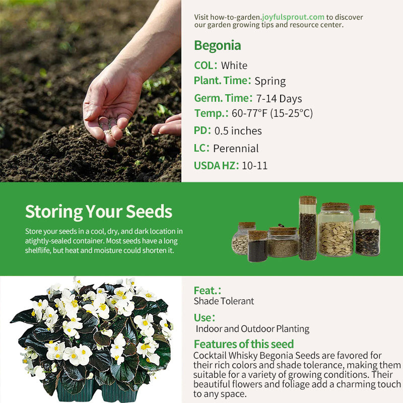 Cocktail Whisky Begonia Seeds are a unique begonia suitable for a variety of growing conditions. Imagine sowing these seeds in your home and waiting for them to grow. Over time, you'll see them flourish, displaying their rich colors and shade tolerance. Each begonia plant adds warmth and vitality to your space. Whether on a balcony, windowsill, or flowerbed, these begonias will become a bright spot in your life, adding a touch of nature to your home.