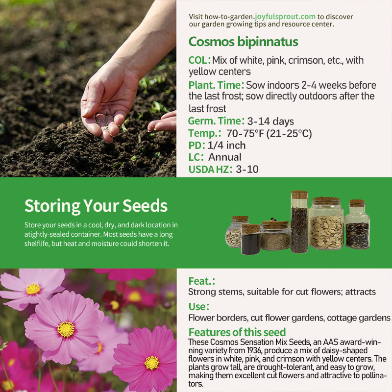 Cosmos Sensation Mix Seeds are a classic blend of annual cosmos, awarded the All-America Selections (AAS) prize in 1936. They combine beauty and practicality. The seeds produce daisy-shaped flowers with yellow centers, in colors ranging from white, pink, and rose-red to crimson. The petals are neatly arranged, and the delicate, feathery foliage adds to their graceful appearance. These plants are highly adaptable, thriving in full sun, even in poor soil, and are exceptionally drought-tolerant, requiring minimal watering. Even novice gardeners can easily grow them. Pinching back the stems when they reach 6 inches promotes branching, and removing spent blooms extends the flowering period until the first frost. The tall stems are ideal for flower borders, and the cut flowers make beautiful, long-lasting arrangements.