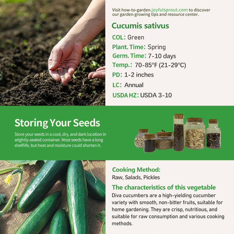 Diva cucumbers are a high-yielding cucumber variety with smooth, non-bitter fruits, suitable for home gardening. They are crisp, nutritious, and suitable for raw consumption and various cooking methods.