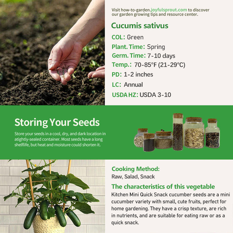Kitchen Mini Quick Snack cucumber seeds are a mini cucumber variety with small, cute fruits, perfect for home gardening. They have a crisp texture, are rich in nutrients, and are suitable for eating raw or as a quick snack.