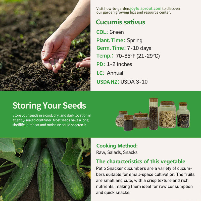 Patio Snacker cucumbers are a variety of cucumbers suitable for small-space cultivation. The fruits are small and cute, with a crisp texture and rich nutrients, making them ideal for raw consumption and quick snacks.