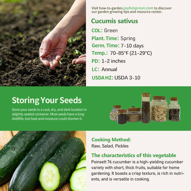 Poinsett 76 cucumber is a high-yielding cucumber variety with short, thick fruits, suitable for home gardening. It boasts a crisp texture, is rich in nutrients, and is versatile in cooking.