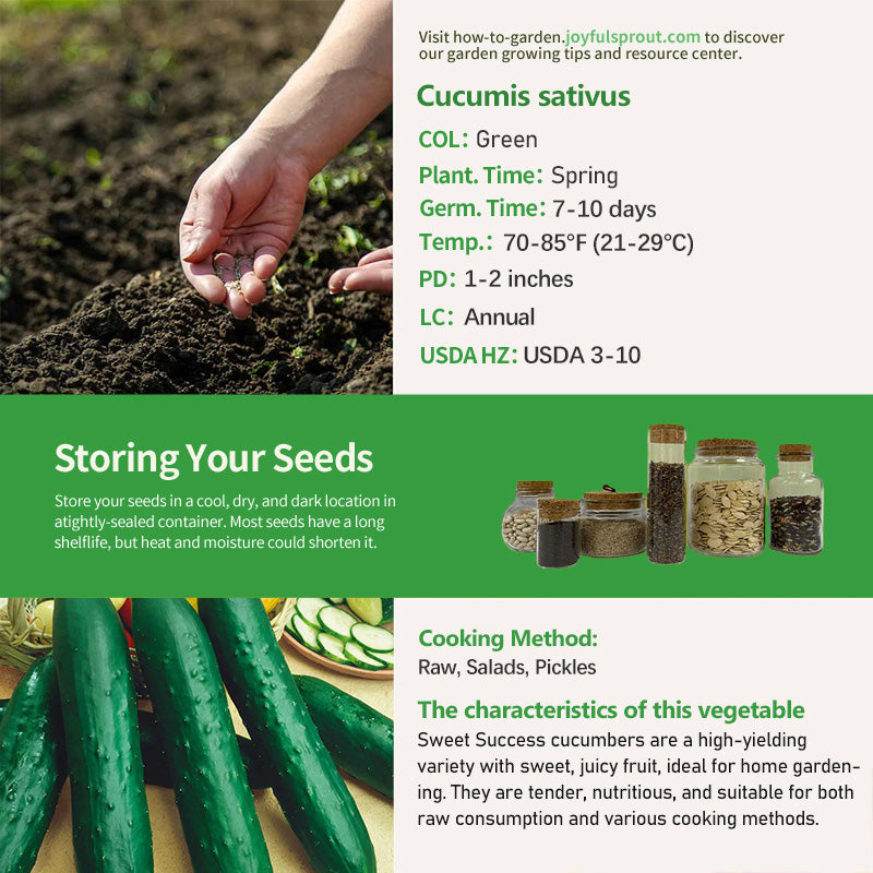 Sweet Success cucumbers are a high-yielding variety with sweet, juicy fruit, ideal for home gardening. They are tender, nutritious, and suitable for both raw consumption and various cooking methods.