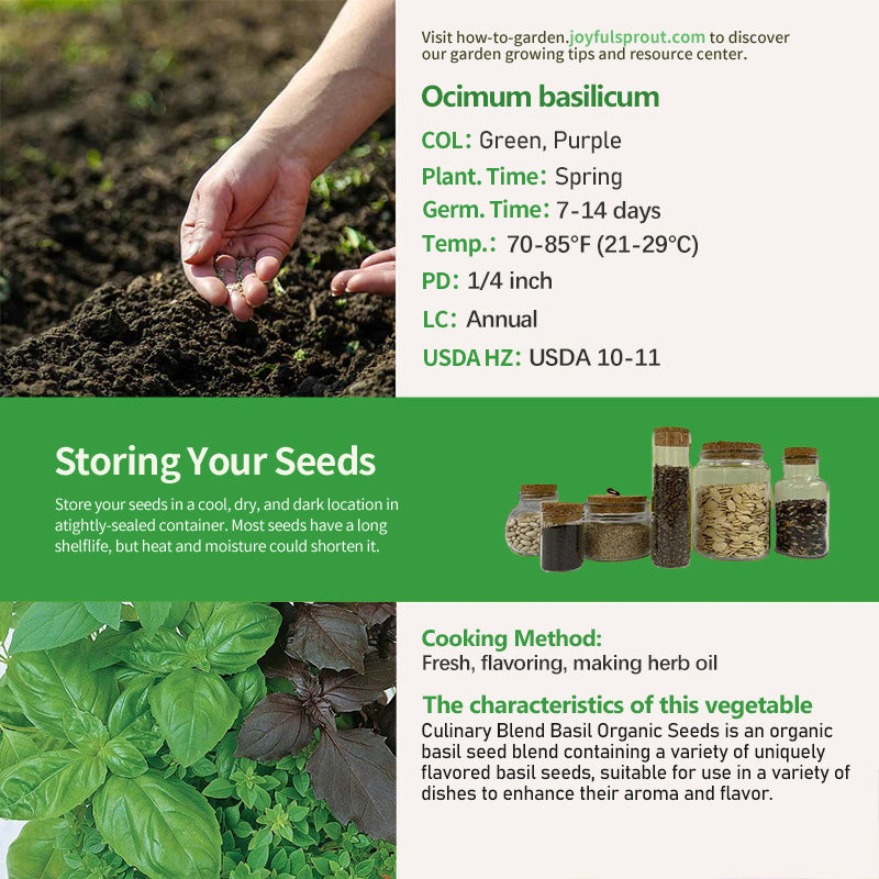 Culinary Blend Basil Organic Seeds is a carefully selected blend of organic basil seeds for cooking enthusiasts. This blend includes a variety of flavorful basils, such as sweet basil, purple basil, and lemon basil, each adding a unique aroma and taste to your dishes. Imagine yourself busy in the kitchen, easily picking fresh basil from your garden and adding it to pasta, salads, or pizzas, instantly elevating the flavors. Culinary Blend Basil is not only delicious but also rich in Vitamin K, Vitamin A, and antioxidants, helping to boost immunity and promote digestion. Enjoy the natural health and deliciousness of your meals with Culinary Blend Basil, making it an indispensable helper in your kitchen.
