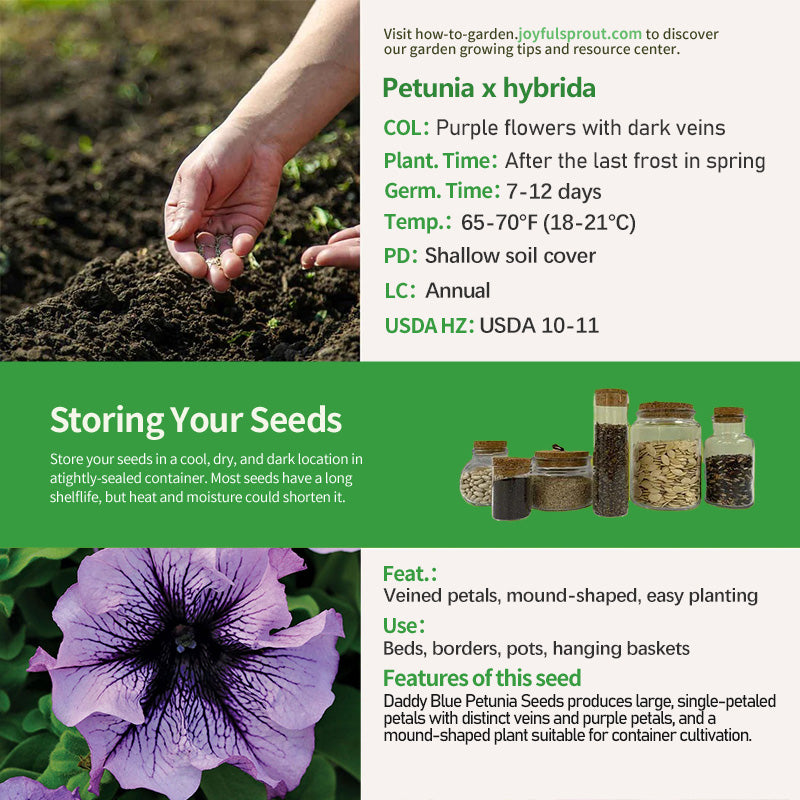 Daddy Blue Petunia Seeds is a large, single-petaled variety with purple petals and distinct veins, approximately 4 inches in diameter. The mound-shaped plant is 10-15 inches tall and spaced 10-14 inches apart. Germination takes 7-12 days, and ideal temperatures range from 65-70°F during the day and 60-65°F at night. This variety is suitable for full sun, has relaxed soil requirements, and is easy to care for, making it suitable for pots, beds, and borders.