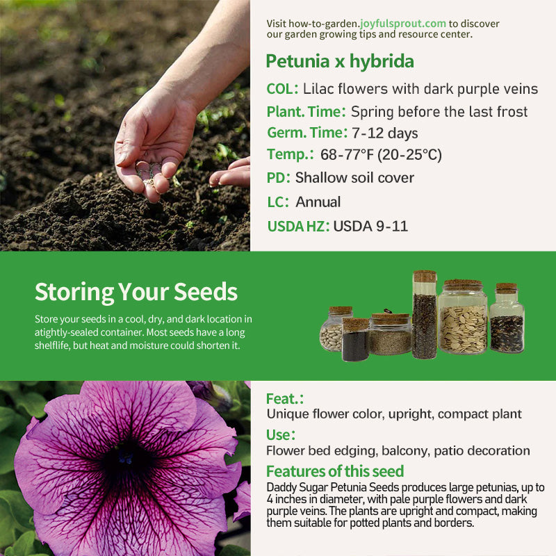 Daddy Sugar Petunia Seeds produces petunias with an upright, compact plant height of 10-15 inches. Their dark green leaves frame the large, 4-inch-diameter flowers. The flowers are pale purple with dark purple veins extending from the center to the edges, creating a delicate pattern and making them highly ornamental. This variety has a relatively quick growing cycle, requiring only 9-11 weeks from sowing to flowering. It is not demanding on soil, as long as it has good drainage. The flowers are more vibrant in full sun, making them suitable for the front row of garden beds or for potted plants on balconies or patios, adding an elegant touch.