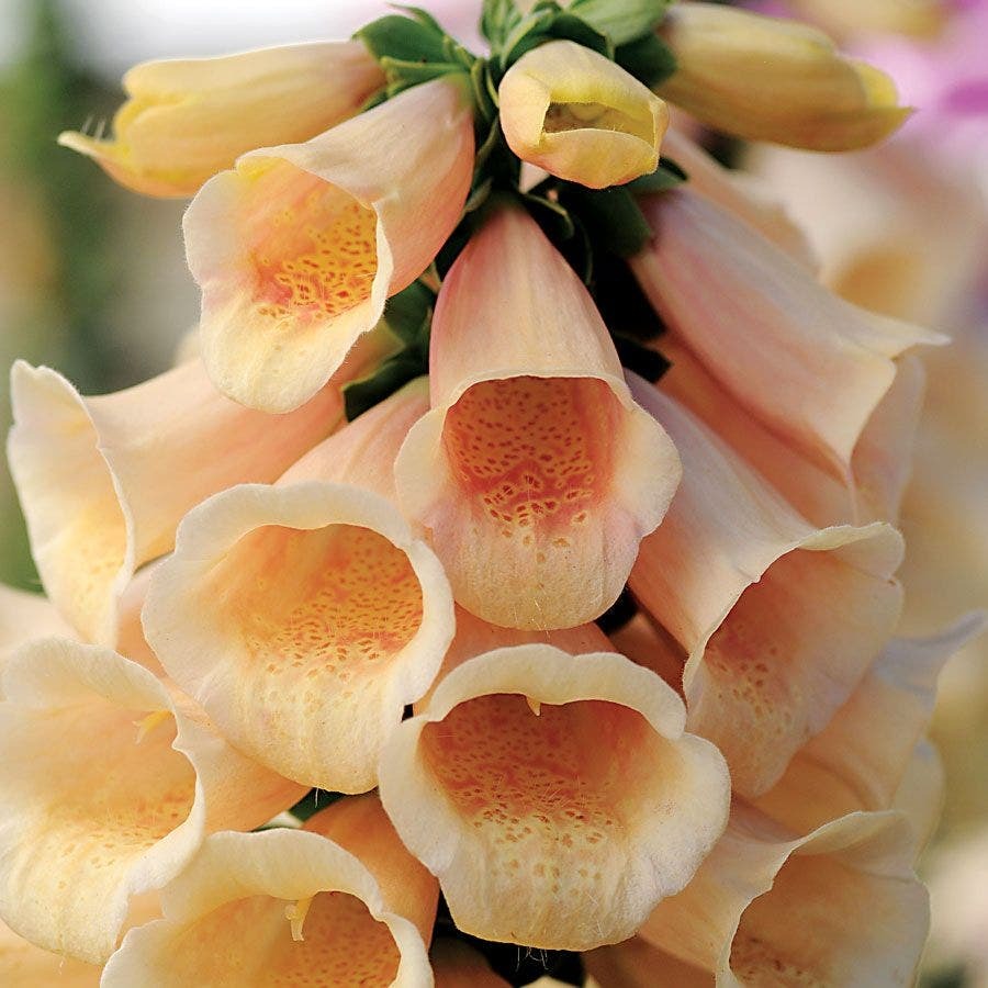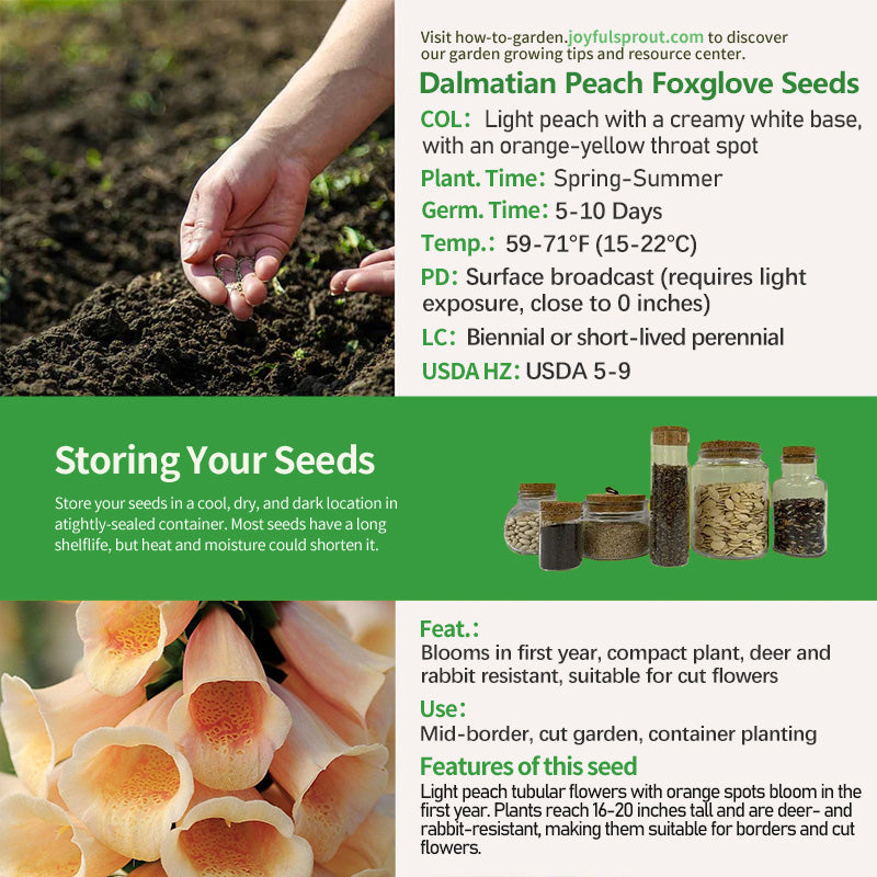 Selected seeds of Digitalis purpurea 'Dalmatian Peach' feature distinctive light peach petals fading to a creamy yellow background, with orange-yellow spots at the throat. The flower spikes stand upright and open from the bottom up. As a dominant cultivar in the Dalmatian series, they bloom in their first year after sowing, with a flowering period lasting from late spring to midsummer. Seeds require sunlight for germination. Sow in loose, moist soil in spring and summer at a temperature of 15-20°C (59-68°F) for germination, and seedlings emerge in 5-10 days. They reach a compact, well-branched plant height of 16-20 inches. Their toxicity makes them deer- and rabbit-resistant, making them ideal for both mid-border landscapes and high-quality cut flowers.