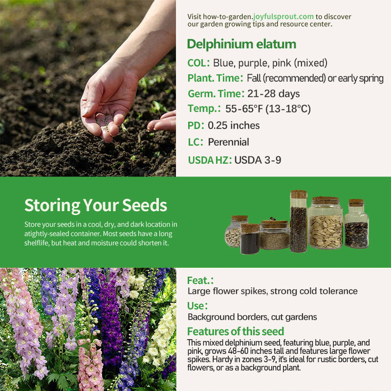 This mixed delphinium seed contains a variety of classic flower colors. It requires a sowing temperature of 55-65 degrees Fahrenheit (13-18 degrees Celsius) and germinates in 21-28 days. Fall sowing is recommended to encourage early flowering the following year. The plant grows tall, reaching 48-60 inches tall, with sturdy flower spikes 12-18 inches long. The flowers range from deep blue to light purple to pink, embodying the wild charm and romance of a country garden. Plant in an open, airy, full-sun location with fertile, well-drained soil. Water regularly to maintain moisture during the growing season. Hardy in zones 3-9, it is highly cold-tolerant and can withstand low temperatures. Its upright stems make it an excellent cut flower and also suitable as a background plant in borders, complementing roses, dahlias, and other flowers to create a rich, layered landscape. Delphinium Giant Cottage Style Mixed Larkspur Seeds