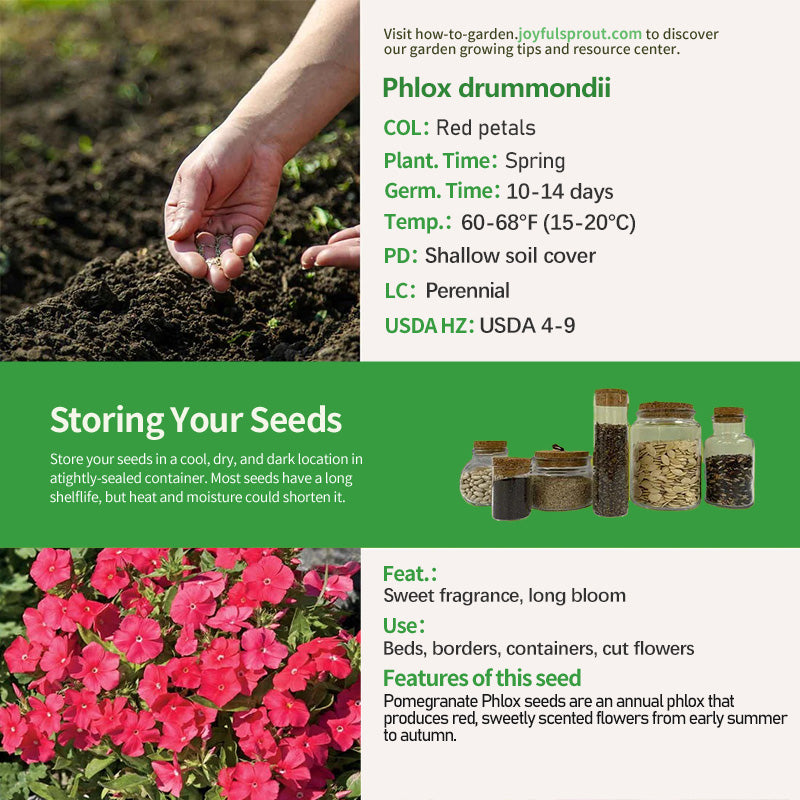 Pomegranate Phlox is an annual phlox grown from seeds. Its flowers are distinctive red, approximately 1.5 inches in diameter, and have a sweet fragrance. Blooming begins in early summer and, in favorable weather and with ample water, continues into autumn, only stopping when frost arrives. The plant reaches a height of 14-20 inches with a crown width of approximately 12 inches, making it suitable for planting in beds, borders, or containers. It can also be grown as a cut flower.