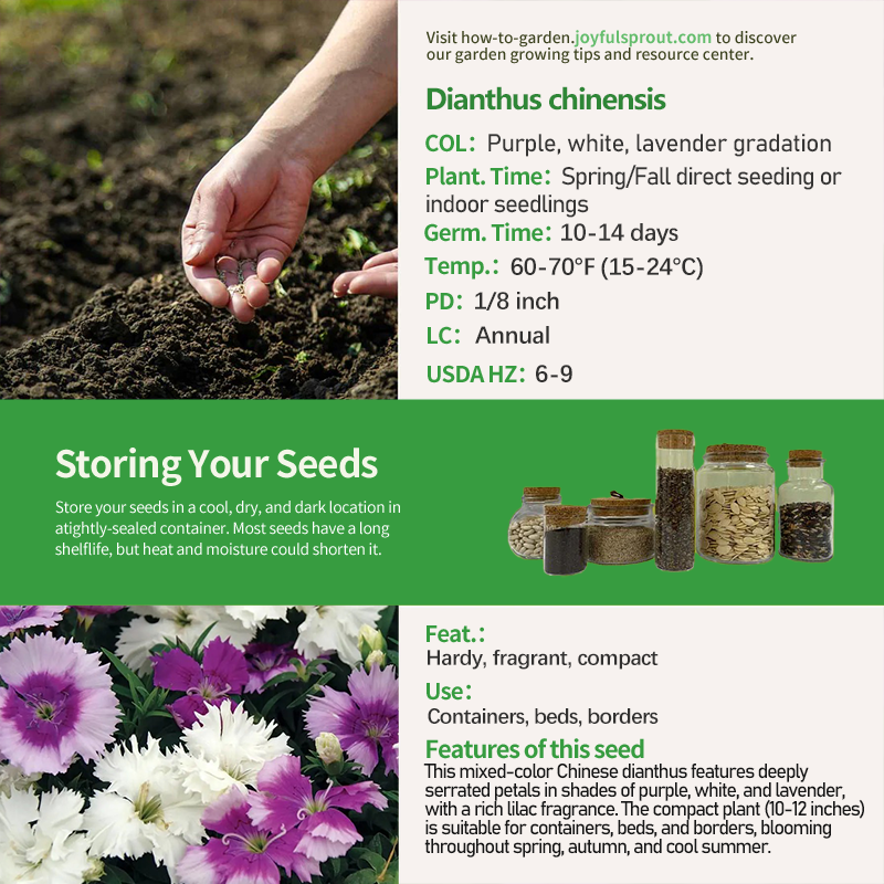 This mixed-color Chinese dianthus features unique purple, white, and lavender gradations with finely serrated edges, releasing a long-lasting lilac fragrance. The compact, rounded plant, approximately 10-12 inches tall, is suitable for potted plants, borders, and rock gardens. It is a cool-season annual or short-lived perennial (overwintering in USDA zones 6-9), flowering year-round in warmer regions, with a brief dormancy during summer heat. It requires full sun and well-drained soil. Germination occurs approximately 14 days after sowing, and it is suitable for direct sowing in spring or autumn, covered with 1/8 inch of soil. As an award-winning European series, its vibrant, contrasting flowers are particularly well-suited for garden paths and patios, and its fragrance can be appreciated up close.