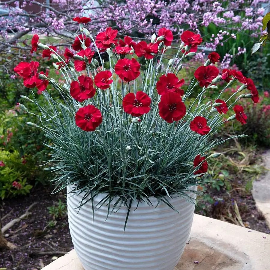 This bright red double dianthus features thick, carnation-like petals, measuring up to 3 inches in diameter, and has a light, spicy aroma. The plant is robust (15-18 inches) and is grown as an annual or short-lived perennial, making it suitable for cut flowers, borders, and garden focal points. It requires full sun and organically rich soil. Germination occurs 5-7 days after sowing, and the soil should be covered with 1/4 inch of soil. Its flowers retain their vibrant color in high temperatures and are highly transportable, making it a popular cut flower. It can be paired with white dianthus or green-foliaged plants to create a classic red and white color scheme.