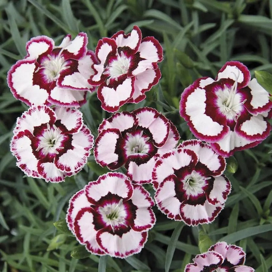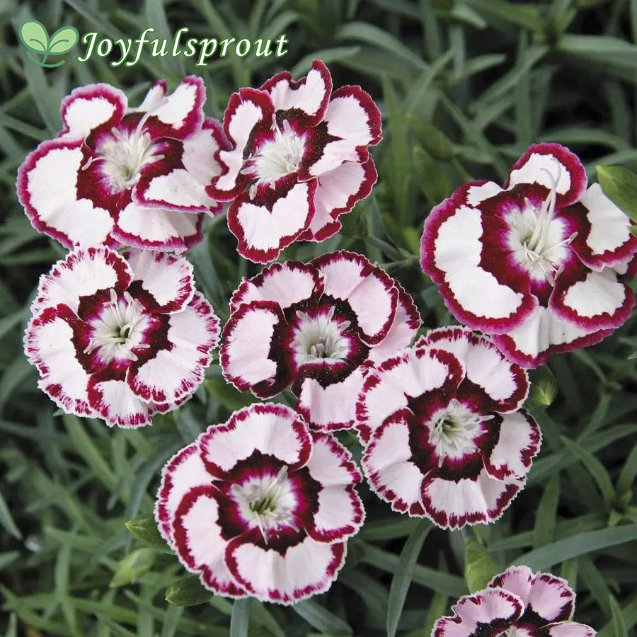 Double dianthus features unique color-changing petals, initially pink with a burgundy edge, which mature to white with a deep pink edge, exuding a rich lilac fragrance. The plant is compact (12 inches), with blue-gray leaves forming a neat basal rosette. It requires full sun and well-drained soil. Germination occurs 7-10 days after sowing, and a 1/8-inch layer of soil is recommended for spring or fall sowing. This variety is hardy in USDA zones 5-9. Pruning after flowering can promote secondary blooms, and the leaves remain semi-evergreen through winter. The color change is particularly noticeable in morning light, making it a good choice for pairing with blue or silver-leaved plants to create a dynamic landscape effect.