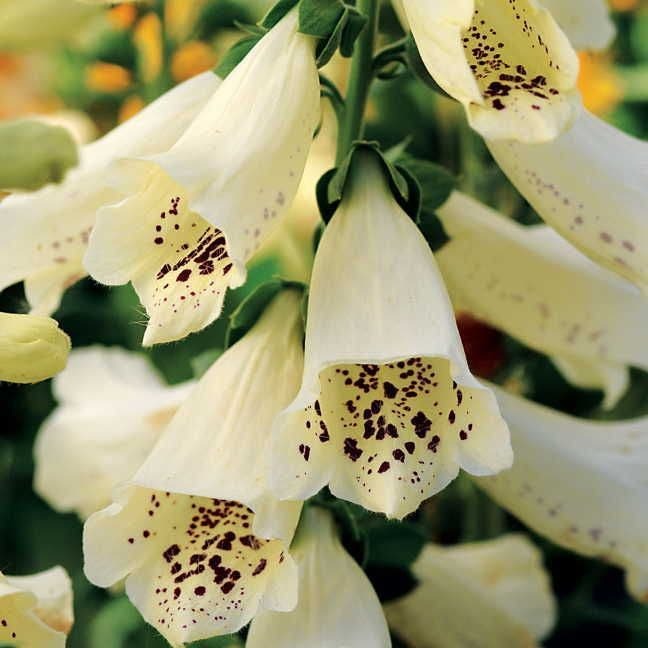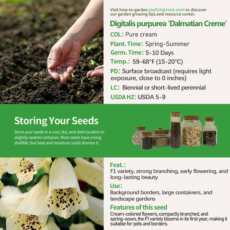 F1 seeds of Digitalis purpurea 'Dalmatian Creme' feature pure, cream-colored tubular flowers that are densely packed and luxuriantly branched. Its breakthrough feature is that it blooms as a year, eliminating the need to wait for the next year, and its flowering period spans from early to midsummer. Sowing should be done in spring or summer, sowing seeds directly onto the soil surface (requiring sunlight to promote germination) and maintaining a temperature of 15-20°C (59-68°F). Germination will occur in 5-10 days, and transplanting and planting can be done after frost. The plant reaches 31-43 inches tall, with lance-shaped, emerald green leaves. It is suitable for 1-2 gallon containers or borders, and its flowers extend its lifespan, making it suitable for beginners.