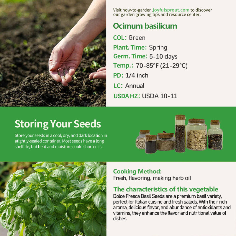 Dolce Fresca Basil Seeds are the soul of Italian cuisine, boasting an intoxicating aroma and delicious taste. Rich in Vitamin K, Vitamin A, and antioxidants, this basil not only elevates the flavor of dishes but also offers significant health benefits. Imagine picking fresh Dolce Fresca basil from your own garden, instantly adding a touch of green vibrancy to pasta or pizza. Its unique flavor and nutritional components make every meal a healthy and enjoyable experience, becoming an indispensable star in your kitchen.