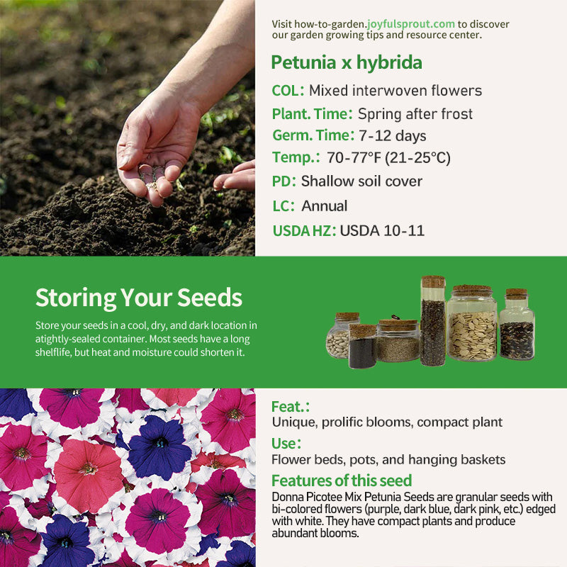 Donna Picotee Mix Petunia Seeds are a hybrid petunia seed with unique bi-colored flowers (purple, dark blue, dark pink, etc.) edged with white. The plants are compact, well-branched, and produce abundant blooms. They are ideal for planting in flower beds, pots, or hanging baskets, adding a beautiful touch of color to any space.