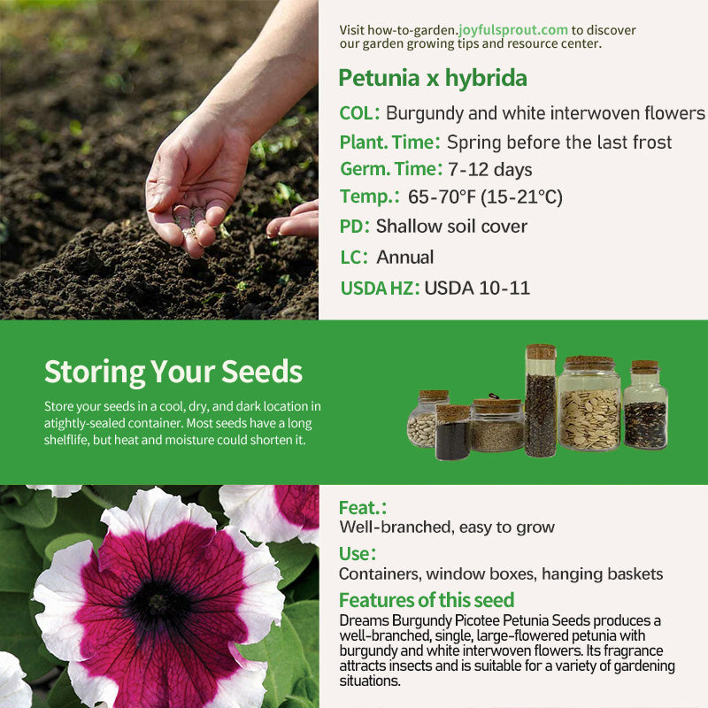 Dreams Burgundy Picotee Petunia Seeds produce well-branched, single, large-flowered petunia. This tender perennial (hardiness zones 10-11) is often grown as an annual. Its burgundy and white interwoven flowers bloom from spring to summer, and its fragrance attracts bees, butterflies, and hummingbirds. The plant has an upright, mound-shaped structure with a well-branched habit. It is easy to grow and thrives in full sun to light shade. It thrives in moderately moist, well-drained soil and can tolerate poor soils. It is virtually pest- and disease-free and deer-resistant.