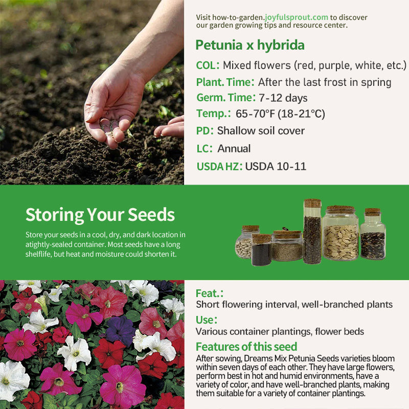 A key feature of the Dreams Mix Petunia Seeds series is that each variety blooms very close together, with a flowering interval of seven days after sowing. The flowers are large (grandiflora), reaching up to 3.5 inches in diameter, and are resistant to damage in hot, humid, and rainy conditions. The flowers are rich in color, including a variety of vibrant hues. The plants branch well, naturally forming a compact, attractive shape. They are suitable for a variety of containers, from small flower pots to large pots, offering excellent viewing. As one of the most popular large-flowered petunias on the market, they easily create a colorful, uniformly blooming landscape.